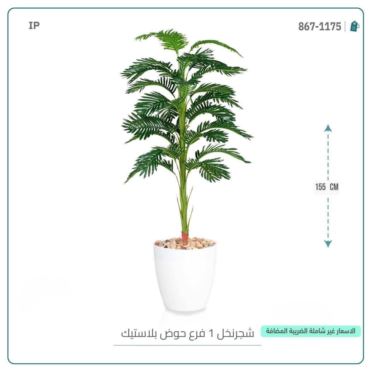 ارتفاع 155 سم يجعلها مناسبة للمساحات المتوسطة والكبيرة، بينما الحوض البلاستيك يوفر ثباتًا وسهولة في النقل والتركيب، مما يجعل وضع الشجرة في أي مكان أمرًا سلسًا وسهلًا.
